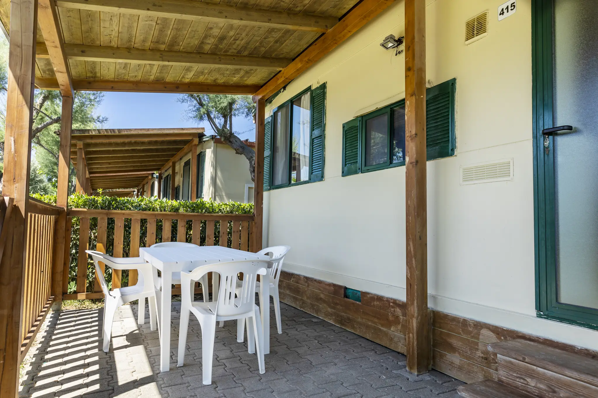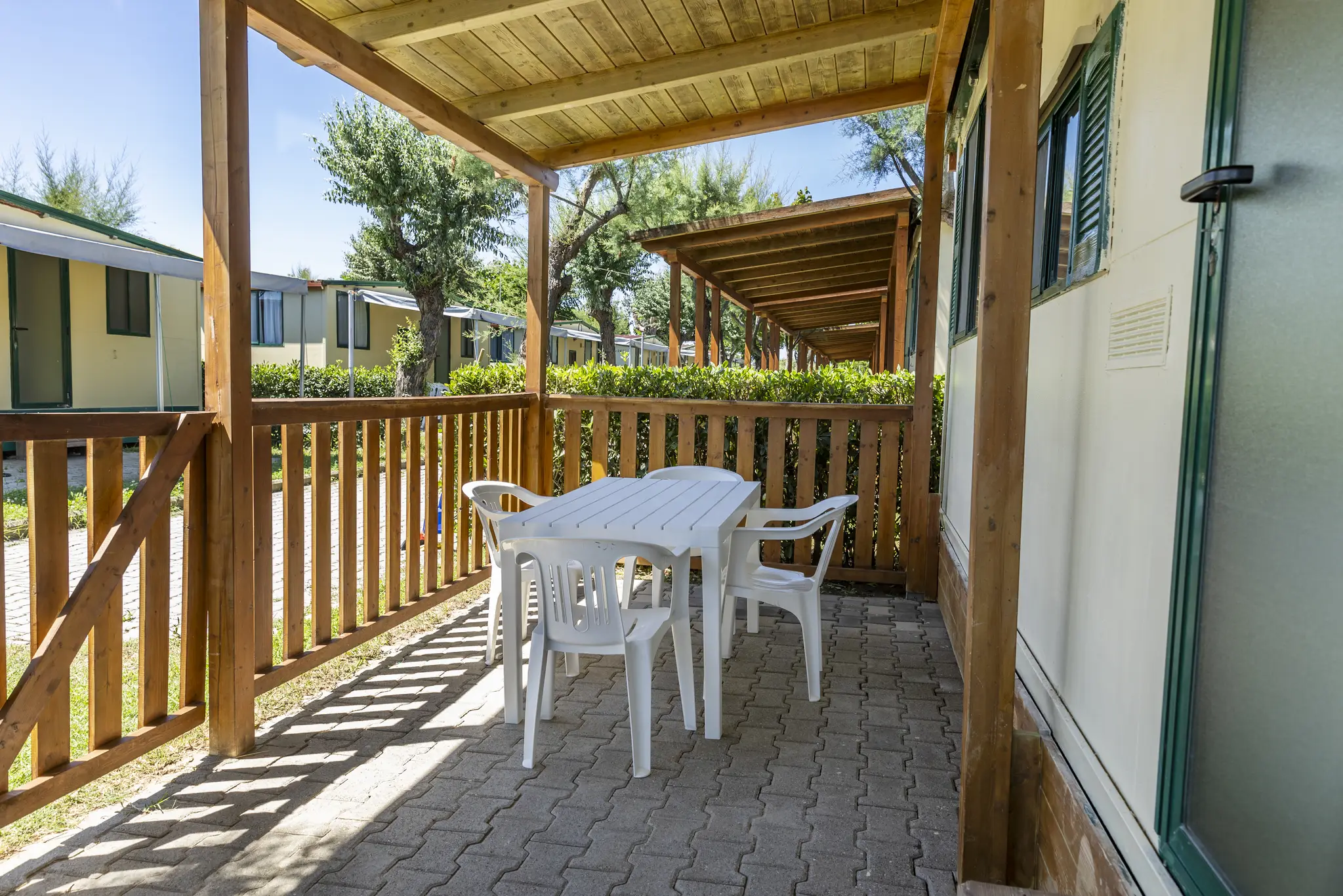 E’ inoltre dotata di un salottino con angolo cucina, frigorifero ALTO CON REPARTO CONGELATORE, allaccio TV e climatizzatore funzionante con tessera prepagata (€1.00/ora). All’esterno è a disposizione una veranda privata, di 12 mq completamente recintata – ideale per i possessori di animali domestici – completa di tavolo e sedie.