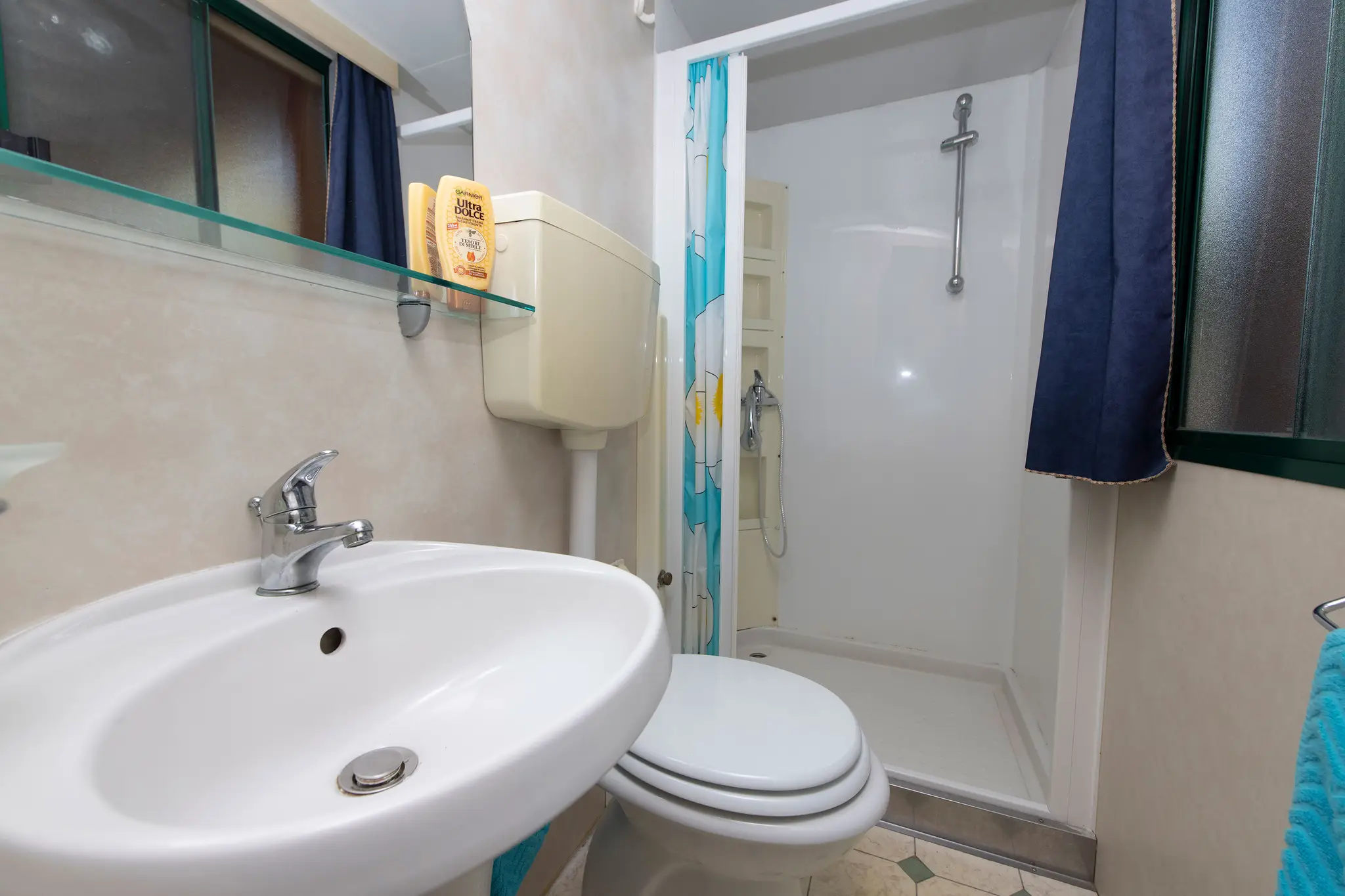 La casa mobile TIPO C è composta da una camera da letto matrimoniale e una camera con due letti singoli, un bagno con box doccia, lavabo e wc.